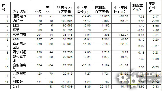 在新一屆世界500強中,主業包括電氣業務的企業有12家,其中5家來自歐洲,來自美國和日本的各3家,還有一家來自韓國。在2009年,這12家世界500強企業完成銷售收入6376億美元,同比下降9.36%,除了來自日本的3家企業和法國的兩家企業收入增長或微幅下降外,其他7家企業收入下降幅度都超過了8%,其中5家企業的收入下降幅度超過14%。伴隨收入的大幅下降的是排名的下降,12家企業合計的排名下降了98位,其中阿爾斯通和阿海琺的排名分別上升了44位和39位,日本3家企業的排名都有一定程度的上升,其他企業的排名都出現了下滑,其中艾默生電氣和施耐德電氣的排名下降了60多位。12家企業的整體贏利能力也出現了下降,日立和東芝的大幅度減虧也沒能扭轉這種局麵,12家企業在2009年的利潤率為3.95%,比上年下降了0.33個百分點,其中3家企業的淨利潤下降幅度超過50%。