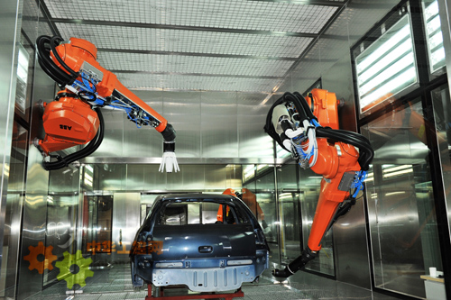 ABB全新的機器人噴塗實驗中心麵積約為500平方米,它可以再現整個汽車噴塗生產線的工藝流程,包括車底打膠和塗裝前的車身擦淨等。整個生產線中應用了ABB一係列先進的噴塗機器人及相關工藝設備,例如: