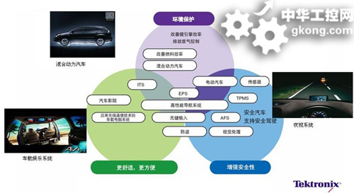 taikedezhuanjiazaiyanjiangzhongqiangtiao,wulunduiyuxuyaogaishanranyouxiaolvhuocaiyongxinnengyuandedonglichuandongxitong,haishiyouzhuyutishengjiacheheyuleshushixingdecheshenjiyingyinyulexitong,yihuozhidong、轉向等安全駕駛係統,局域網(LAN)的使用量正不斷提高,以實現傳動控製、車身控製或各種線控操作(X-by-wire control);由(you)於(yu)需(xu)要(yao)提(ti)高(gao)汽(qi)車(che)的(de)能(neng)耗(hao)效(xiao)率(lv),因(yin)此(ci)汽(qi)車(che)的(de)引(yin)擎(qing)控(kong)製(zhi)單(dan)元(yuan)和(he)電(dian)源(yuan)係(xi)統(tong)變(bian)得(de)更(geng)加(jia)複(fu)雜(za),而(er)混(hun)合(he)動(dong)力(li)和(he)清(qing)潔(jie)燃(ran)料(liao)柴(chai)油(you)機(ji)技(ji)術(shu)要(yao)求(qiu)高(gao)級(ji)電(dian)子(zi)控(kong)製(zhi)係(xi)統(tong),以(yi)保(bao)證(zheng)安(an)全(quan)及(ji)環(huan)保(bao);利用電子控製單元(ECU)控製基本汽車係統和非基本汽車係統正成為新的行業標準,這些ECU基於數字技術(MCU、FPGA等器件),要求更深入地了解複雜的定時和信號完整性問題;汽車安全係統采用胎壓監測(TPMS)和RFID係統,需要開發和測量實時RF係統,要能夠高效監測汽車操作和狀態。