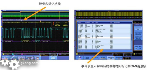 對於汽車中常用的CAN、LIN這類低速串行總線的調試,泰克的DPO/MSO4000係列示波器提供了簡單、易用、完整、高品質的觸發、捕獲和解碼解決方案。如圖2,該示波器係列提供了搜索和標記功能,可在事件表顯示解碼後的帶有時間標記的CAN消息幀,這一功能是其他競爭性產品所不具備的。