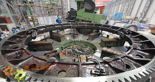 河南洛陽中信重工的重型裝備製造廠車間正在緊張生產(2008年12月12日攝)。新華社發