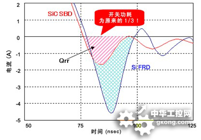 圖2:相比SiFRD(碳化矽快速恢複二極管),SiC-SBD的功率轉換效率大幅提升。(來源:ROHM公司)。