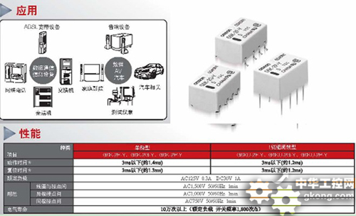 同樣,在精密電子元器件領域具有世界級技術實力的歐姆龍,利用其獨特的傳感與控製技術持續實現了繼電器、開關、轉接器等電子產品的小型化、高性能和節能特性,也必將為西部高端電子元器件應用帶來更多新選擇。歐姆龍電子部件的展品包括:FPC連接器、IDC連接器等(應用領域從移動設備到產業機器);高可靠性的繼電器,可用於通信基礎設施、數碼家電、加工機床等設備;還有可應用於產業設備、家電、車載、娛樂相關設備等各種領域的開關產品。最近,該公司高5.2mm×寬6.5mm×長10mm的超小型表麵安裝繼電器G6K-Y係列在中國實現了量產。這種繼電器號稱具有世界最小級別的封裝麵積與高度,適用於高密度封裝,並實現最低功耗100mW。