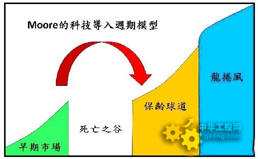 對於新技術導入市場的成長過程,Moore把它劃分為早期市場、死亡之穀、保齡球道、helongjuanfengdengsigejieduan。meiyijieduandeshichangtexingdoubuxiangtong,yejiebixuzhenduimeiyijieduandetexing,nidingshidangdeshichangtuidongcelve,caiyoukenengchixuyouyigejieduanyanjindaoxiayigejieduan。