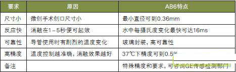 上shang述shu導dao管guan和he射she頻pin消xiao融rong微wei創chuang手shou術shu具ju有you創chuang口kou小xiao,無wu法fa直zhi接jie觀guan察cha的de特te點dian,但dan溫wen度du和he壓ya力li參can數shu又you是shi其qi手shou術shu成cheng功gong的de關guan鍵jian參can數shu,因yin此ci對dui安an裝zhuang在zai其qi前qian端duan的de溫wen度du傳chuan感gan器qi和he壓ya力li傳chuan感gan器qi要yao求qiu更geng為wei苛ke刻ke:尺寸微小,但精度和可靠性極高。GE的AB6係列溫度傳感器專為此類應用而開發(見圖1、表1)。
