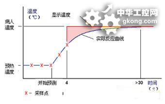 快速反應電子體溫計一般由感溫探頭、信號處理單元、顯示屏、電源四部分構成,信號處理單元內部有加熱算法和預測算法。加熱算法使得感溫探頭接近人體溫度,縮短溫度上升時間;預測算法在探頭和人體接觸後開始運行,利用溫度上升的趨勢來預測人體最終的體溫。最好的情況下此類體溫計4秒即可以出結果,遠遠快於普通電子體溫計的2分鍾,測溫過程示意圖如圖2所示。
