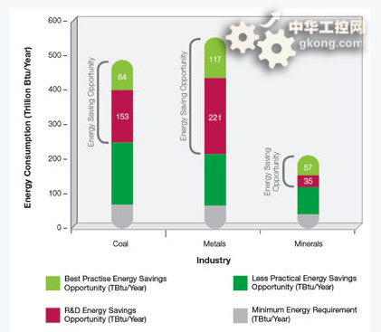 那麼,究竟礦業企業是否有節能增效的潛力呢?請看圖1,該圖是美國對工業的3個分支——煤炭、冶金和礦石處理3個ge細xi分fen行xing業ye的de能neng源yuan使shi用yong統tong計ji分fen析xi圖tu。圖tu中zhong,灰hui色se部bu分fen是shi最zui小xiao的de能neng源yuan需xu求qiu,紅hong色se部bu分fen是shi通tong過guo研yan發fa節jie能neng的de機ji會hui,淡dan綠lv色se部bu分fen為wei通tong過guo引yin用yong最zui佳jia實shi踐jian帶dai來lai的de節jie能neng機ji會hui。通tong過guo上shang圖tu可ke見jian,無wu論lun是shi煤mei炭tan、冶金還是礦石處理,相對於目前的能源消耗,都有較大的潛在節能空間。