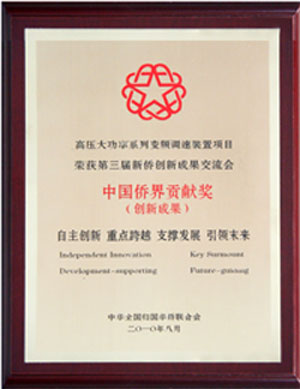 8月24日,為期六天的“第十屆海外高新技術人才為國服務暨第三屆新僑創新成果交流會”在北京人民大會堂隆重舉行。會上,由中華全國歸國華僑聯合會評選的“中國僑界貢獻獎”同時揭曉,九洲電氣總經理趙曉紅主持研發的科技成果“高壓大功率係列變頻調速裝置項目”成功通過專家委員會評審,被授予“中國僑界貢獻獎”創新成果獎。