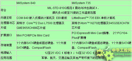 淩華科技MilSystem係列係統自高端性能至低功耗組合皆有,滿足客戶不同需求。MilSystem 840內主板搭載英特爾Core™2 Duo L7500處理器,擁有1.6 GHz處理速度、以及兩個DDR2內存SO-DIMM插槽,最高容量達4GB。在圖像性能方麵,MilSystem 840內的主板支持英特爾圖形媒體加速器GMA X3100、加上容量最高達384MB的64位共享顯存,可支持CRT屏幕、平麵麵板、寬屏幕數字電視顯示,分辨率最高達2048x1536像素(可支持HDTV規格的1920x1080 @ 85Hz分辨率);而MilSystem 735則搭載LittleBoard™ 735主板,搭載英特爾Atom™ N270處理器、最高容量達2GB的DDR2內存插槽,以及英特爾圖形媒體加速器GMA 950,可支持分辨率達2048x1536像素。兩款係統的主要規格與特色請參見下表:
