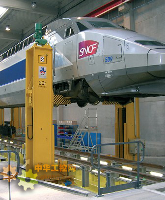 SNCF(法國國營鐵路公司)的新“東歐技術中心”安裝了一個世界上最強大的起重係統。該係統的同步起重線可提起一列完整的TGV火車組—長約200米,重約386噸—短短10分鍾內即可達到1毫米的精度,從而使傳動裝置的維護成為可能。
