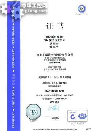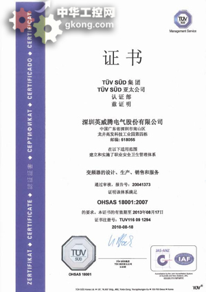 日前,英威騰電氣獲得國際權威認證機構TUV公司予以認證的ISO14001:2004環境管理體係與OHSAS18001:2007職業健康安全管理體係!
