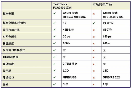FCA和MCA係列儀器可用於設計、生產和實驗室校準,以及雷達設備測試等現場應用中的頻率、時間或相位信號參數的測量與分析。下表以FCA3100為例,列舉了泰克破局頻率計市場的一些利器,以及如何實現產品性能和功能的“五級跳”。