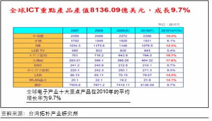 全球電子產業十大重點產品在2010年的平均增長率為9.7%