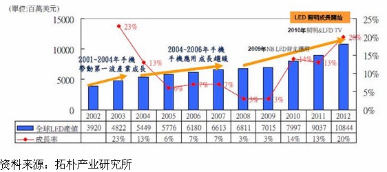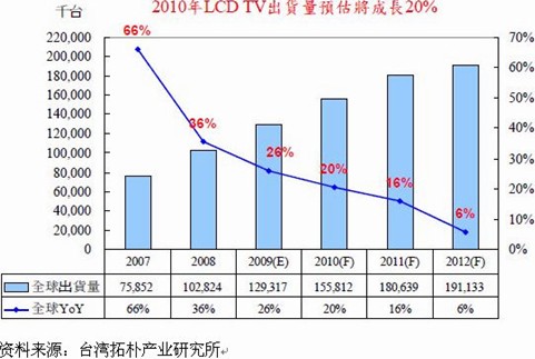 到2012年,LCD TV出貨量逐年上升,增長率逐年下降。