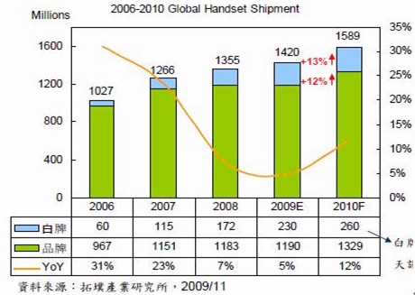 2010年全球手機出貨(不含白牌)將增長12%,上半年出貨超越2008年同期水準,下半年旺季維持增長。2G手機出貨集中在新興市場(2和3級城市),3G手機滲透新興市場主要城市,WCDMA/HSDPA/LTE通訊技術演進成形。智能型手機價格持續降低,逐步滲透Feature Phone市場,2010年出貨增長29%。