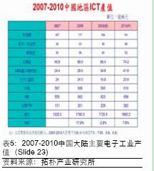 2010年中國大陸電子產業十大發展趨勢為:1)整體IT產業供不應求,產值增長7.8%,需求增長12.4%;2)半導體市場需求明顯反彈,由負增長轉為增長11.8%;3)筆記本電腦作為最大的終端IT產業,產值穩定增長6.1%;4)整體手機產業小幅反彈,產值增長2.5%;5)LCD TV產業仍保持2位數高增長,產值增長15.9%;6)大尺寸LCD麵板市場需求仍然旺盛;7)政策及新的應用驅動LED照明產業高速增長;8)筆記本電腦替換台式PC加速,出貨量大增,銷售額增長9.1%;9)LCD TV在TV市場一枝獨秀,銷售額增長18.2%;10)整體手機市場趨於成熟,銷售額小幅增長4.4%。