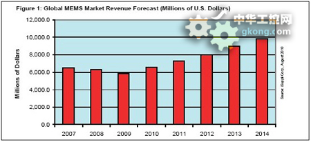 預計2010年總體芯片產業增長30.8%,雖然MEMS市場的增長率與此相比可能顯得比較蒼白,但MEMS產業並不遵循半導體產業的景氣周期。實際上,整體來看,2009-2014年MEMS擴張速度將快於芯片產業,複合年度增長率為10.7%,高於半導體產業的9.6%。