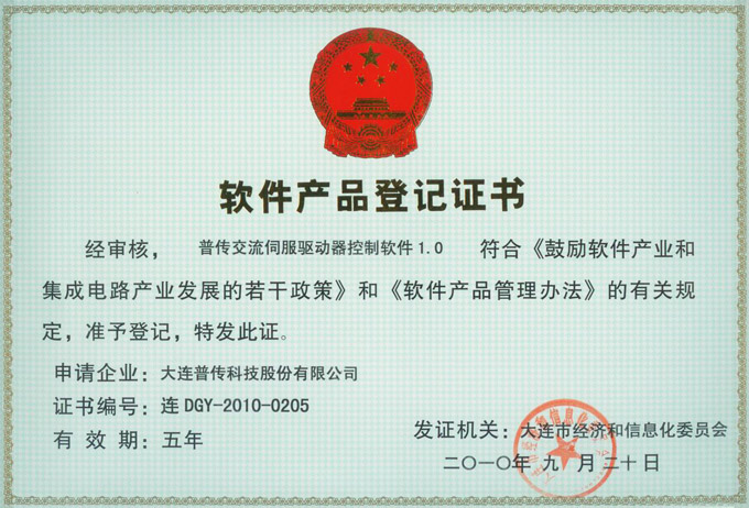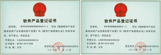 2010年9月20日,普傳科技的“普傳科技變頻器調速控製軟件V1.0”等三款軟件獲“軟件產品登記證書。 “普傳科技變頻器調速控製軟件V1.0”、“普傳交流伺服驅動器控製軟件V1.0”和“普傳變頻器鍵盤控製軟件V1.0”是普傳科技自主研發的變頻器及交流伺服驅動器的核心技術產品。產品經申請、專家現場檢驗和相關審核等程序,符合《鼓勵軟件產業和集成電路產業發展的若幹政策》和《軟件產品管理辦法》的有關規定,由大連市經濟和信息化委員會頒發了“軟件產品登記證書”。證書有效期為5年。 以yi上shang證zheng書shu的de獲huo得de,不bu僅jin意yi味wei著zhe公gong司si技ji術shu創chuang新xin的de能neng力li不bu斷duan提ti高gao,進jin一yi步bu提ti升sheng公gong司si的de產chan品pin在zai同tong行xing競jing爭zheng中zhong的de優you勢shi地di位wei,同tong時shi還hai將jiang享xiang受shou到dao政zheng府fu部bu門men政zheng策ce優you惠hui。