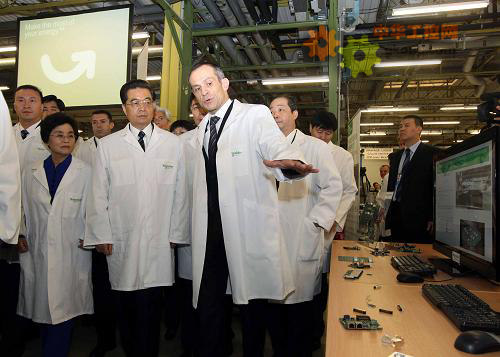 胡錦濤在趙國華和法國經濟、財政與就業部長拉加德等陪同下來到生產車間參觀。他身著防塵服邊走邊看,認真聽取法方管理人員介紹有關情況。在質量跟蹤控製機器人前,在集成電路板展示台前,在自動化控製盒前,胡錦濤不時駐足觀看,詢問相關技術、市場以及節能降耗等方麵的情況。