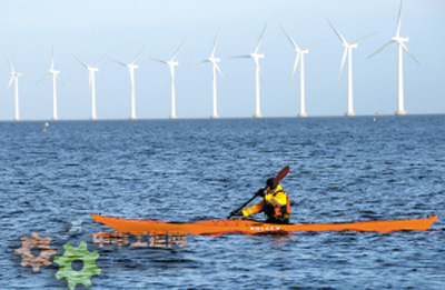 在丹麥首都哥本哈根,一名男子在海上劃艇,遠處是一組風力發電機組。趙長春 攝