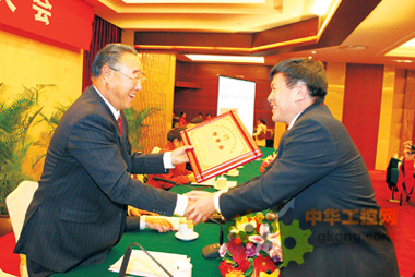 圖為中國機械工業聯合會會長王瑞祥為獲得特等獎的大連重工·起重集團頒獎。(王振生攝)