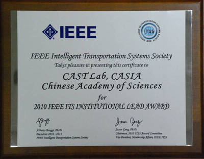 據最新一期IEEE《智能交通快訊》,在葡萄牙馬德拉召開的第十三屆IEEE智能交通係統年會上,以王飛躍研究員為首的中國科學院自動化研究所複雜自適應交通係統團隊獲得2010年度的IEEE智能交通係統傑出團隊獎(IEEE ITS Institutional Lead Award),以表彰該團隊在智能交通控製與管理方麵所做出的貢獻。
