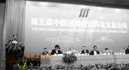 ▲圖為中國德力西控股集團董事局主席胡成中(左一)在第五屆中國民營經濟科學發展論壇上發言。(盧友中 攝影)