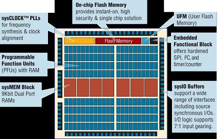 Lattice的低密度FPGA建jian立li在zai非fei易yi失shi性xing閃shan存cun技ji術shu基ji礎chu之zhi上shang。通tong過guo將jiang閃shan存cun集ji成cheng進jin芯xin片pian內nei部bu,並bing同tong時shi采cai用yong片pian上shang穩wen壓ya器qi和he振zhen蕩dang器qi,與yu采cai用yong外wai部bu閃shan存cun的de方fang案an相xiang比bi,這zhe種zhong單dan芯xin片pian方fang案an不bu僅jin具ju有you節jie省sheng成cheng本ben和he芯xin片pian麵mian積ji的de優you勢shi,還hai能neng夠gou帶dai來lai瞬shun間jian上shang電dian的de好hao處chu,使shi芯xin片pian能neng夠gou及ji時shi上shang電dian運yun行xing複fu位wei、電源管理等功能。在安全性方麵也有更好的保證。