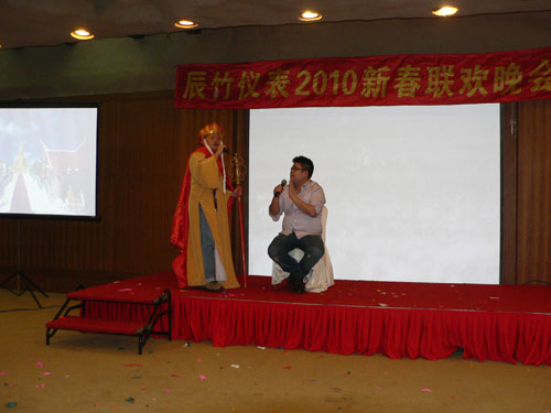 晚19:30,我公司員工自編自導自演的2010新春聯歡晚會正式拉開序幕。由技術部王睿和製造部張越聯袂主持,公司各部門精心組織排練節目,形式多樣:有小品、樂器演奏、獨唱、大合唱、遊戲等,好戲連台、精彩紛呈,引來現場掌聲與喝彩聲不斷。最後,銷售部《四大才子》與供應鏈《唐僧東遊記》獲得全體員工廣泛好評,被票選為“我最喜愛的春晚節目”。