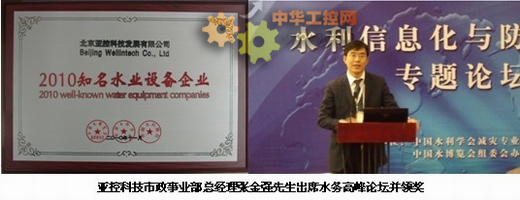 2010年是 “十一五”規劃的最後一年,也是 “十二五”計劃的開局之年。為了宣傳和弘揚水務行業精神,盤點水務行業格局,展望水務行業走向,在這承前啟後的重要年頭,中國水利學會、中國水博覽會組織委員會、中國水利報社舉辦了2010“年度知名水務企業、年度最具成長力水業品牌”評選活動。頒獎儀式與“第五屆中國(國際)水務高峰論壇”同期舉行。亞控科技憑借其在推進水行業“兩化融合”進程中做出的卓越貢獻和取得的輝煌成績贏得了行業用戶、專家、協會、媒體的高度讚賞,榮獲2010知(zhi)名(ming)水(shui)業(ye)設(she)備(bei)企(qi)業(ye)大(da)獎(jiang),也(ye)是(shi)獲(huo)獎(jiang)廠(chang)商(shang)中(zhong)唯(wei)一(yi)的(de)自(zi)動(dong)化(hua)軟(ruan)件(jian)產(chan)品(pin)和(he)方(fang)案(an)提(ti)供(gong)商(shang)。亞(ya)控(kong)科(ke)技(ji)市(shi)政(zheng)事(shi)業(ye)部(bu)總(zong)經(jing)理(li)張(zhang)金(jin)強(qiang)先(xian)生(sheng)出(chu)席(xi)水(shui)務(wu)高(gao)峰(feng)論(lun)壇(tan)並(bing)領(ling)獎(jiang)。