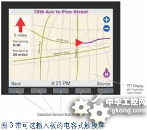 舉ju例li來lai說shuo,電dian容rong式shi觸chu摸mo技ji術shu支zhi持chi高gao度du的de靈ling活huo性xing與yu可ke定ding製zhi性xing,使shi車che載zai設she計ji人ren員yuan能neng將jiang新xin特te性xing與yu現xian有you機ji械xie設she計ji相xiang結jie合he,以yi增zeng強qiang功gong能neng,取qu代dai傳chuan統tong按an鈕niu,采cai用yong觸chu摸mo板ban輸shu入ru與yu電dian容rong式shi觸chu摸mo屏ping等deng,支zhi持chi接jie近jin感gan應ying技ji術shu或huo上shang述shu各ge種zhong功gong能neng的de組zu合he。