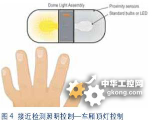 接(jie)近(jin)感(gan)應(ying)比(bi)按(an)鈕(niu)增(zeng)強(qiang)和(he)按(an)鈕(niu)替(ti)代(dai)更(geng)進(jin)一(yi)步(bu)。利(li)用(yong)接(jie)近(jin)感(gan)應(ying)功(gong)能(neng),我(wo)們(men)甚(shen)至(zhi)可(ke)以(yi)完(wan)全(quan)不(bu)使(shi)用(yong)按(an)鈕(niu),這(zhe)樣(yang)就(jiu)實(shi)現(xian)了(le)全(quan)麵(mian)的(de)設(she)計(ji)靈(ling)活(huo)性(xing),支(zhi)持(chi)任(ren)意(yi)模(mo)塊(kuai)封(feng)裝(zhuang)尺(chi)寸(cun),而(er)且(qie)也(ye)提(ti)高(gao)了(le)係(xi)統(tong)可(ke)靠(kao)性(xing)。接(jie)近(jin)感(gan)應(ying)技(ji)術(shu)主(zhu)要(yao)應(ying)用(yong)於(yu)照(zhao)明(ming)控(kong)製(zhi)領(ling)域(yu),如(ru)車(che)廂(xiang)頂(ding)燈(deng)(見下)、門側儲物盒以及存儲箱照明應用。