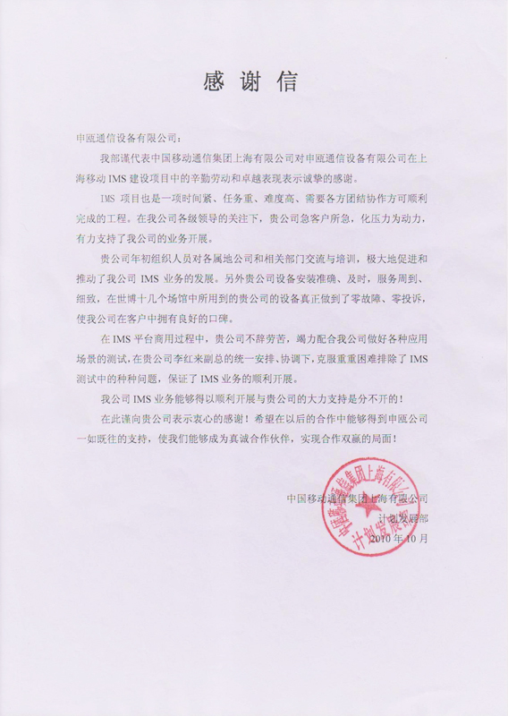 2010年5月1日至2010年10月31日世博期間,我公司IMS融合通信產品在世博十幾個場館(如美國館)中使用做到了零故障、零投訴,使中國移動上海分公司在客戶中擁有良好的口碑,為此上海移動特向我公司發來感謝信,感謝我公司為推動IMS業務順利開展所做出的努力。 10月9日上午,“首屆中國.浙江成長型中小企業投融資洽談會”在浙江省人民大會堂隆重召開。參加會議的有工業和信息化部總工程師朱宏任、浙江省副省長金德水、浙江省中小企業局局長高鷹忠、中國股權投資基金協會會長邵秉仁、省內外知名銀行或信貸投融資機構和省內知名企業代表等1000多人參加了此次會議。我公司辦公室主任萬謙勇參加了此次會議。會議主要開展了浙江省100家最具投資價值中小企業評比發布、成長型中小企業投融資對接會等。我公司喜獲首屆最具投資價值稱號。
