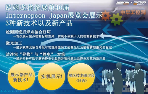 歐姆龍將參展於2011年1月19日至21日在日本東京有明國際展覽中心 (Tokyo Big Sight, Japan)舉行的Internepcon Japan展覽會。歐姆龍不斷追求生產現場品質的提高,提供優良的產品。本次歐姆龍展位的看點在於有效提高品質的3種新產品和新技術。真誠歡迎你光臨歐姆龍展位。