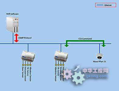 Moxa主動以太網I/O解決方案可發送用戶自定義的CGI命令,這通常是IP視頻監控係統中常用的一種協議。有了這個功能,ioLogik E2200可以輕鬆與IP攝像頭通訊,以激活蜂鳴器或觸發報警。