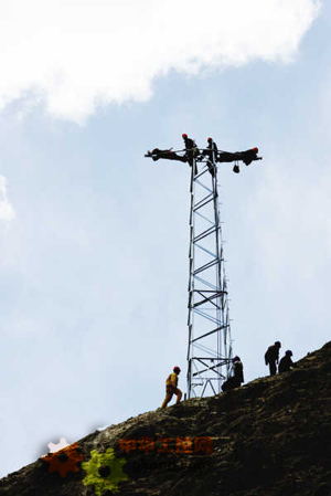 5月28日,西藏拉孜縣彭措林鄉查達村,電力員工正在架設10千伏鐵塔。