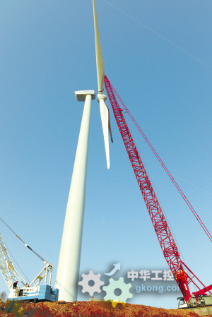 2010年12月8日,施工人員正在位於江淮分水嶺的安徽來安楊郢龍頭港風力發電場吊裝最後1台風電機組的葉片,完成一期33台裝機49.5兆瓦風力發電機組吊裝任務。宋衛星 攝(英大圖片)