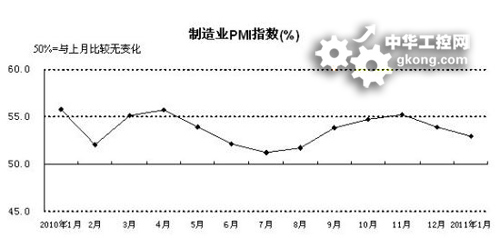 2011年1月,中國製造業采購經理指數(PMI)為52.9%,低於上月1.0個百分點。自2009年3月以來,該指數已連續二十三個月位於臨界點——50%以上的擴張區間,表明中國製造業經濟總體繼續保持增長態勢,但增速放緩。