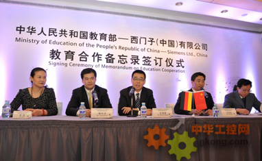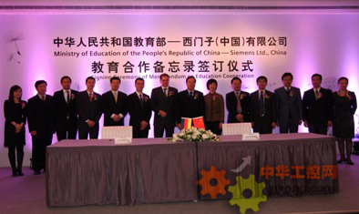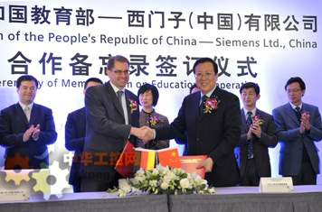 2011年2月16日,中華人民共和國教育部—西門子(中國)有限公司教育合作備忘錄簽訂儀式在北京隆重舉行。教育部副部長郝平與西門子(中國)有限公司執行副總裁、東dong北bei亞ya工gong業ye業ye務wu領ling域yu總zong裁cai吳wu和he樂le博bo士shi共gong同tong宣xuan布bu雙shuang方fang將jiang合he作zuo推tui動dong中zhong國guo工gong程cheng教jiao育yu發fa展zhan。西xi門men子zi承cheng諾nuo為wei中zhong國guo高gao校xiao和he職zhi業ye院yuan校xiao培pei養yang高gao素su質zhi的de工gong程cheng人ren才cai貢gong獻xian力li量liang——把西門子在工業界最新的技術帶到教育領域,把西門子的工程師培養機製、員工培訓體係、認證體係和追求卓越、矢誌創新、勇擔責任的企業文化帶進校園。這一合作標誌著西門子正式與教育部建立長期戰略合作夥伴關係,以加強雙方在教育領域的密切合作。