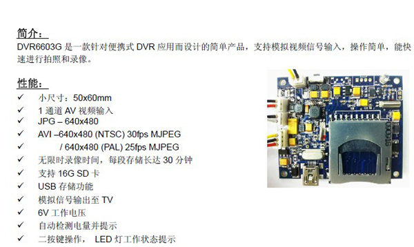 DVR6603G目前為了迎合市場對佩戴式、口袋式等便攜DVR的發展需求而最新升級了程序。為了匹配廣大用戶的應用需求,文件格式修正為標準的VGA格式;另外,增加新功能無限製錄像時間,每30分鍾存儲一段錄像,16GSD卡存儲,使用更加方便、簡單和快捷,使產品設計更加人性化。現該產品更加適合配備給檢測人員用於隨身檢測以及需要進行圖像記錄的簡單應用。