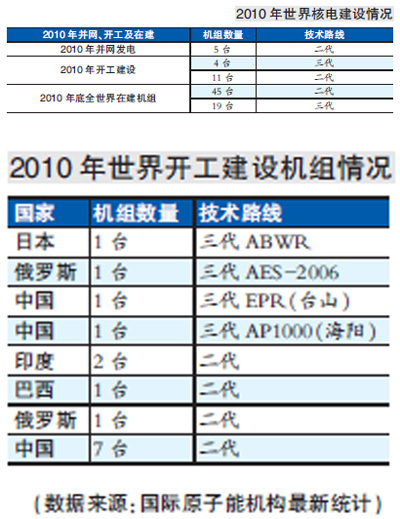 據了解,2010年我國建成2台新的核電機組,投入商運的核電機組增至13台,總裝機容量達到1080萬千瓦,占世界核電總裝機容量(3.75億千瓦)的2.88%;2010年我國新開工建設10台核電機組,在建核電機組數達到28台,總裝機容量為3097萬千瓦,占全球在建核電總規模的40%以上。