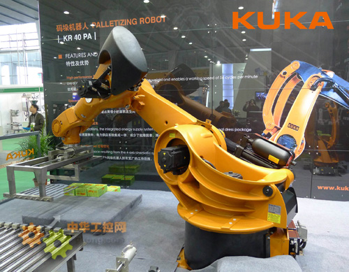 此次展出的庫卡KR 40 PA四軸型碼垛機器人是一款創新的、快速有效的自動化設備,工作範圍可達2091毫米,有效負載能力為40公斤。由於使用了新型碳纖維加強材料 CFK,其自身的重量減少至僅700公斤,從而在保持較低慣性力的前提下有效確保其更快、更高地加速和減速。