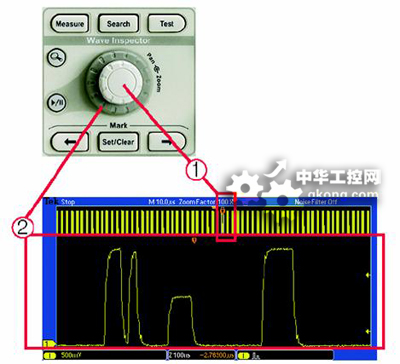 Wave Inspector控製功能在查看、導航和分析波形數據方麵實現了前所未有的效率。通過旋轉外部卷動控製功能(2),您可以瀏覽1M 點記錄,在幾秒鍾內從開頭瀏覽到結尾。想查看感興趣的事件、想查看更多的細節?您隻需旋轉內部縮放控製功能(1)就可以。