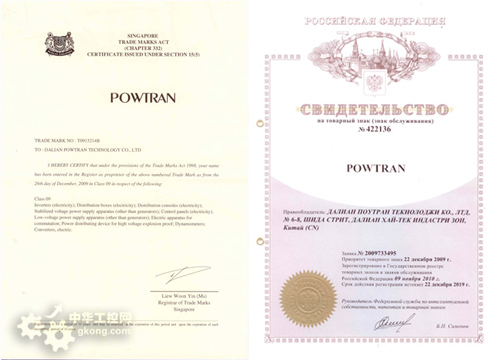 繼POWTRAN(注冊號1910436))被認定為省“著名商標”後,目前公司已在德國(注冊號30200907414B)、俄羅斯(422136)、新加坡(T0915214B)等國成功注冊POWTRAN商標,商品類別為第09類,含逆變器、變頻器、穩壓電源、低壓電源、電站自動化裝置等商品。美洲國家注冊工作正在審核中。
