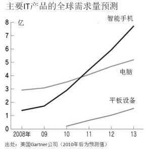 根據美國市場調查公司IDC的預測,2011年智能手機的全球售量為4億2098萬部,超過了電腦售量的3億8503萬台。在美國Apple公司的“iPad”2010年點燃了平板電腦設備的市場需求之後,美國Gartner公司預測,2013年全球平板電腦售量有望達到1億5415萬部,接近個人電腦的30%。