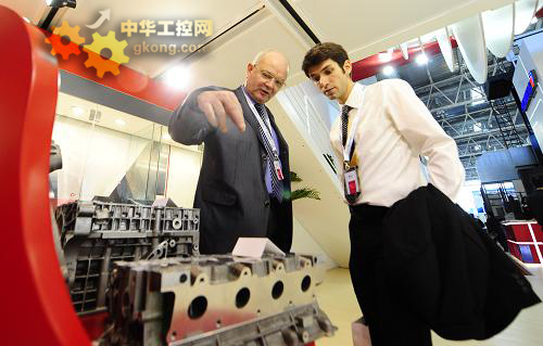 4月11日,兩位外國客商在觀看由數控機床加工出的汽車發動機缸體。新華社記者 任勇 攝