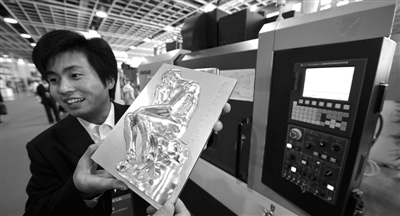圖為參展企業人員在展示高精度數控機床雕刻出的金屬浮雕工藝品。新華社記者孫 參攝