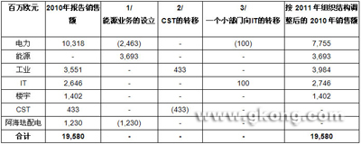 經過調整的2010年數據反映了施耐德電氣機構設置的以下變化:1)中壓業務(包括阿海琺配電)從電力轉至新設立的能源業務中;2)CST業務因有類似的終端市場覆蓋和盈利能力而被歸入工業業務;3)一個較小的業務部門(2010年銷售額為1億歐元)從電力轉入IT業務。