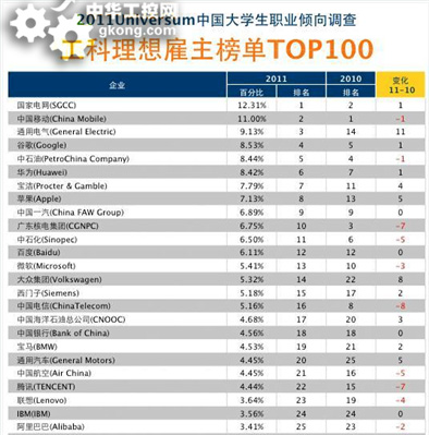 2011年5月5日,上海--近日,“青年理想家”2011中國大學生職業傾向調查結果正式公布。在工科理想雇主榜單上,GE力壓Google、寶潔,榮膺榜眼,成為排名最高的外企,亦成為榜單的一大亮點。去年,GE名列第14位。本次調查由新華社《環球》雜誌主辦,優興谘詢(Universum)提供專業谘詢支持,於2010年11月至2011年3月麵向全國90所重點高校學生進行的職業傾向調查,共收集到有效問卷46080份,理想雇主評價(Employer Evaluation)近13萬次。