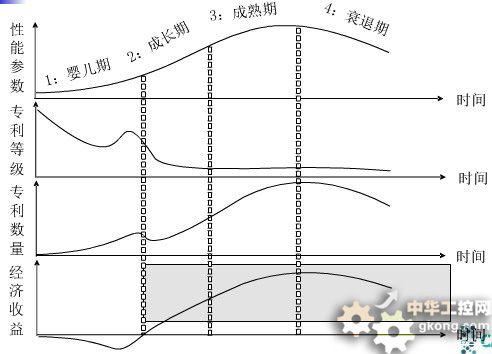 一個產品的周期將要經曆嬰兒期、成長期、成熟期、衰(shuai)退(tui)期(qi)。在(zai)專(zhuan)利(li)等(deng)級(ji)上(shang),首(shou)先(xian)原(yuan)創(chuang)性(xing)專(zhuan)利(li)層(ceng)次(ci)是(shi)最(zui)高(gao)的(de),通(tong)過(guo)一(yi)係(xi)列(lie)的(de)應(ying)用(yong)突(tu)破(po),達(da)到(dao)一(yi)定(ding)高(gao)度(du)後(hou),將(jiang)會(hui)越(yue)來(lai)越(yue)低(di)。在(zai)專(zhuan)利(li)數(shu)量(liang)上(shang),當(dang)達(da)到(dao)高(gao)峰(feng)期(qi)後(hou),到(dao)後(hou)期(qi)都(dou)是(shi)一(yi)些(xie)垃(la)圾(ji)專(zhuan)利(li)。經(jing)濟(ji)的(de)收(shou)益(yi),前(qian)期(qi)都(dou)是(shi)在(zai)付(fu)出(chu),隻(zhi)有(you)在(zai)後(hou)期(qi)才(cai)會(hui)有(you)收(shou)益(yi)。